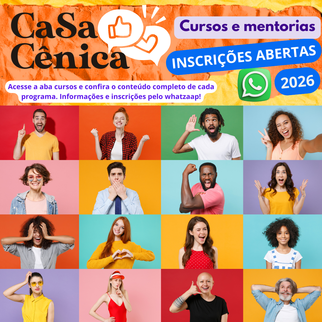 A Casa Cênica em 2026 prepara cursos e mentorias para você fazer direto da sua casa com qualidade de conteúdos e professores experientes e capacitados para ajudá-lo na sua jornada pessoal. Porque, sobretudo, a arte em diferentes países do mundo, como a Suíça e a Dinamarca são extremamente valorizadas e consideradas primordiais ao desenvolvimento humano, e por aqui, como um país criativo que somos, que pulsa arte e cultura, não pode ser diferente. Entendemos que arte anda de mãos dadas com o seu bem estar, sua saúde mental e física, o seu autoconhecimento e o desenvolvimento das suas potencialidades. Nosso desejo é que você tenha uma experiência transformadora, lúdica, profunda e prazerosa, e inclua o fazer arte em sua rotina, com as nossas aulas de teatro, expressão, dança e movimento, e em breve música.